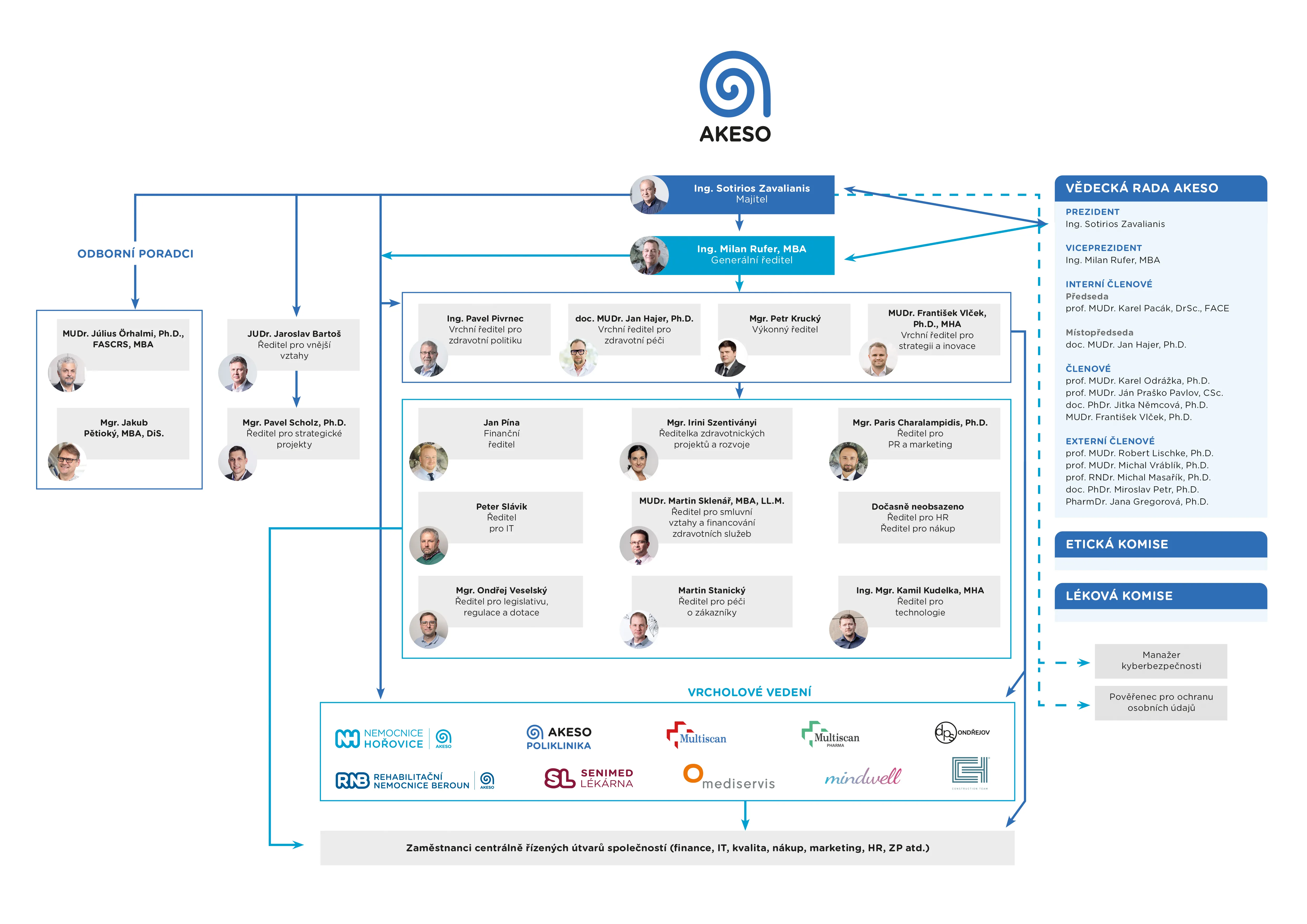 Jsme zdravotnický holding AKESO, jeden z předních poskytovatelů zdravotní péče v Česku. Provozujeme Nemocnici Hořovice, AKESO POLIKLINIKU v Praze, Rehabilitační nemocnici Beroun, Centrum duševní rehabilitace, Denní psychoterapeutické sanatorium "Ondřejov" a onkologické a radiologické centrum Multiscan, které je součástí Komplexního onkologického centra Pardubického kraje. Vedle těchto zařízení patří do skupiny AKESO i další ambulance, síť lékáren SENIMED, distributoři léčiv a zdravotních materiálů či vlastní stavební firma Construction Team. S holdingem je spjata také prémiová zdravotní péče Altoa a digitální psychoterapeutická platforma Mindwell.